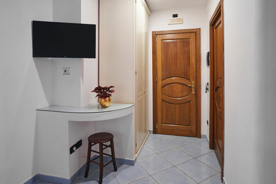 Die Pompei Valley Suite ist ein luxuriöser offener Raum mit moderner Einrichtung und Glasfaserbeleuchtung. Es bietet eine private Terrasse, einen eingelassenen Whirlpool, eine Glasdusche im Zimmer, einen Holztisch und einen Pelletkamin. Das Badezimmer ist mit einem luxuriösen Pflegeset für ein umfassendes Wellness-Erlebnis ausgestattet.